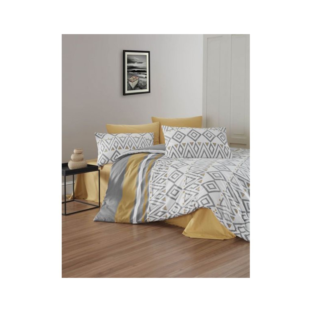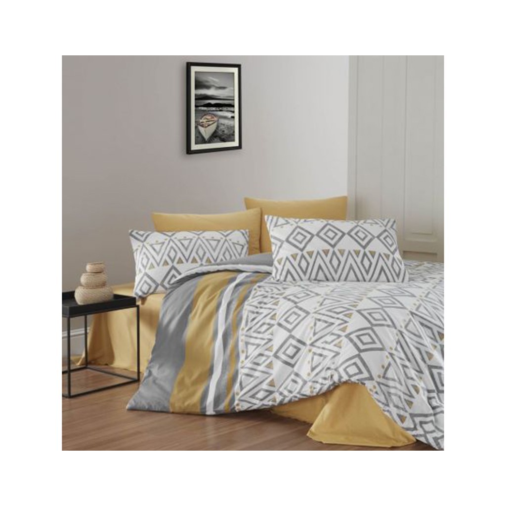 Енергичната колекция на турския производител ZAMBAK представя триелементен комплект с динамичен ромбовиден десен в смела цветова комбинация. Жълтото, сивото и бялото се преплитат в геометрична композиция, която внася жизненост и характер в спалното пространство. Изработен изцяло от натурален памук, комплектът предлага не само визуална привлекателност, но и функционален комфорт за ежедневна употреба в единично легло.