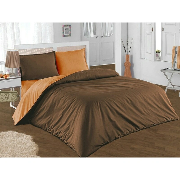 Двуцветен спален комплект от четири части на българската марка RAKLA, изработен от ранфорс (100% памук), в цвят кафяво/оранжево.