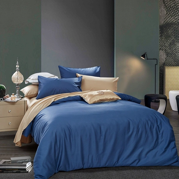 Двуцветен спален комплект от четири части на българската марка RAKLA, изработен от ранфорс (100% памук), в цвят тъмносиньо/канела.