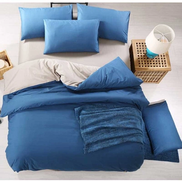 Двуцветен спален комплект от четири части на българската марка RAKLA, изработен от 100% памук ранфорс, в цвят тъмносиньо/сиво.