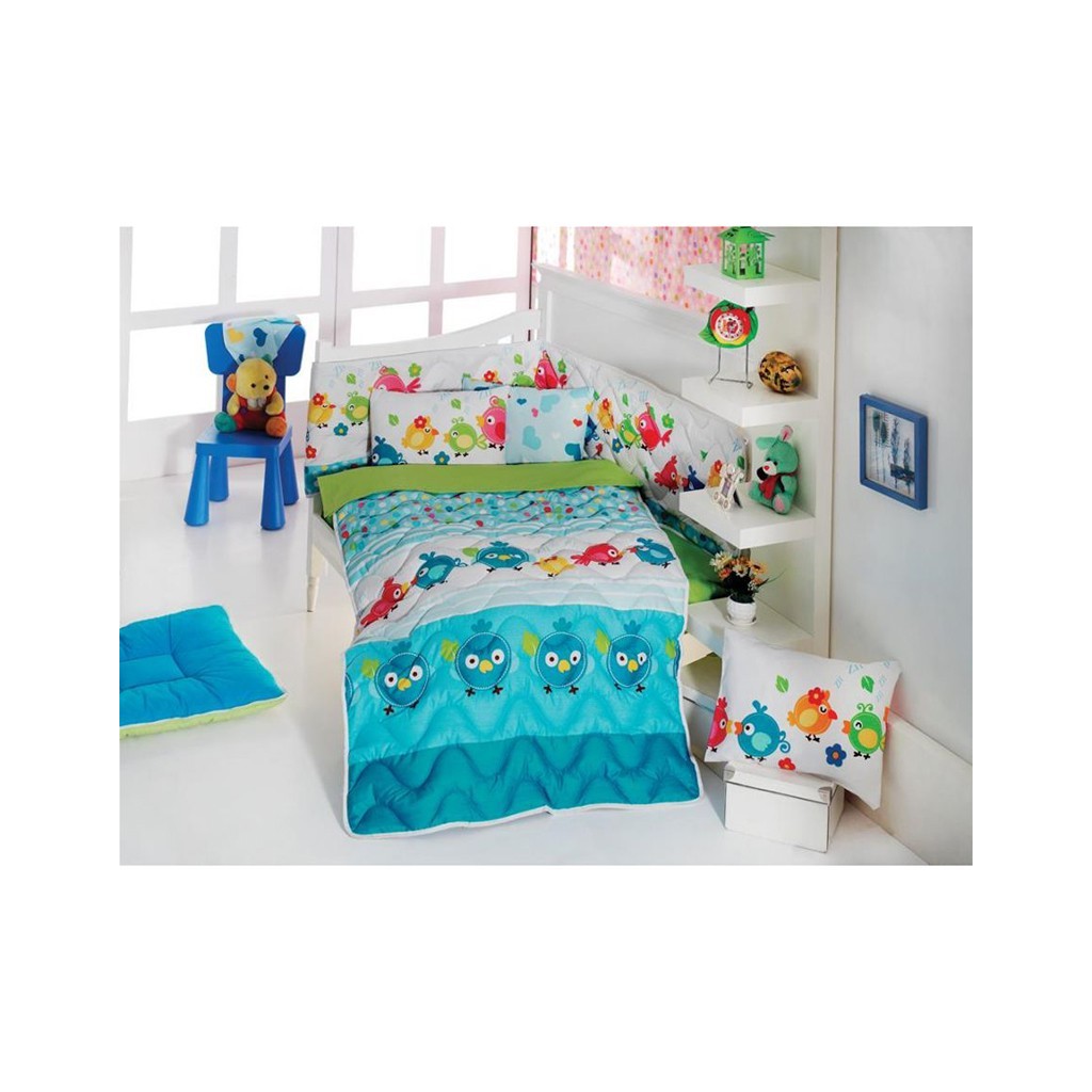 Пълният спален комплект от осем части представлява цялостно решение за обзавеждане на бебешкото легло с всичко необходимо за комфортен и безопасен сън. Изработен изцяло от стопроцентов памук с Ранфорс плетка, комплектът осигурява оптимална грижа за нежната детска кожа и създава уютна среда за почивка. Включените елементи покриват всички нужди – от завивки и възглавници до защитен обиколник, който превръща легълцето в сигурно и топло гнездо.