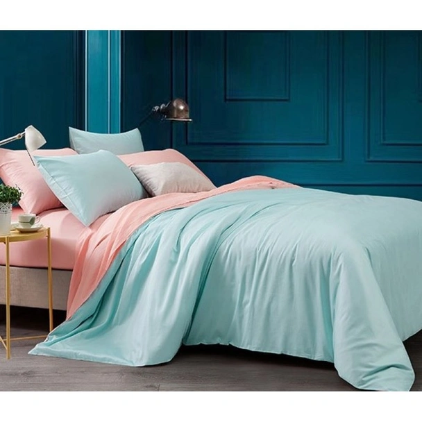 Двуцветен спален комплект от четири части на българската марка RAKLA, изработен от 100% памук ранфорс, в цвят светлорозово/петрол.