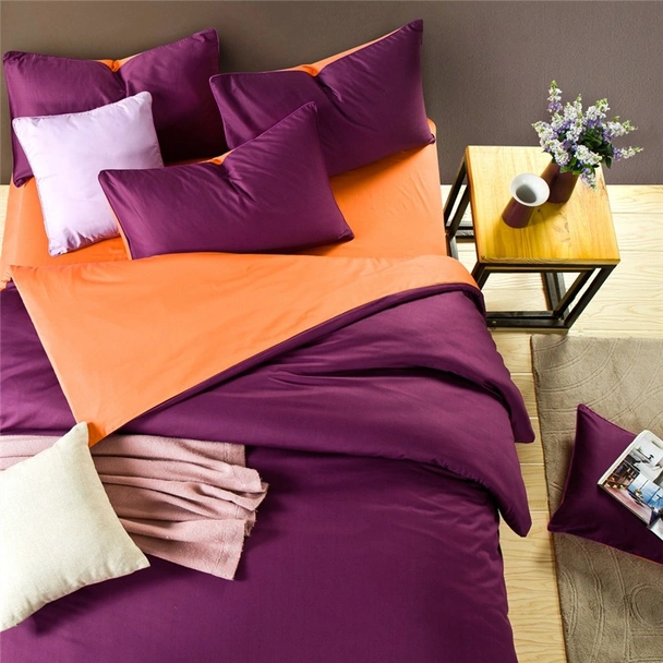 Двуцветен спален комплект от четири части на българската марка RAKLA, изработен от 100% памук ранфорс, в цвят тъмнолилаво/оранжево.