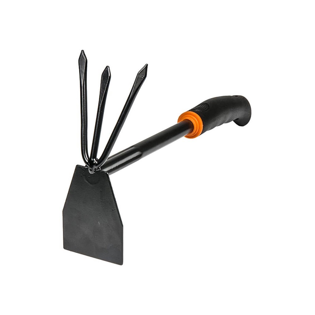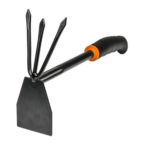Градинският инструмент е с трапецовидна мотичка от едната страна и три зъба от другата.
