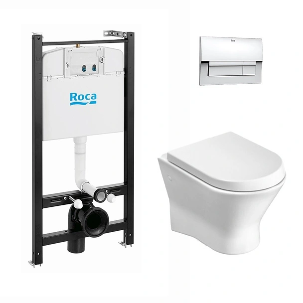 Комплект структура за вграждане с казанче, окачена тоалетна чиния Nexo и двоен бутон за вградено казанче на испанския производител ROCA.