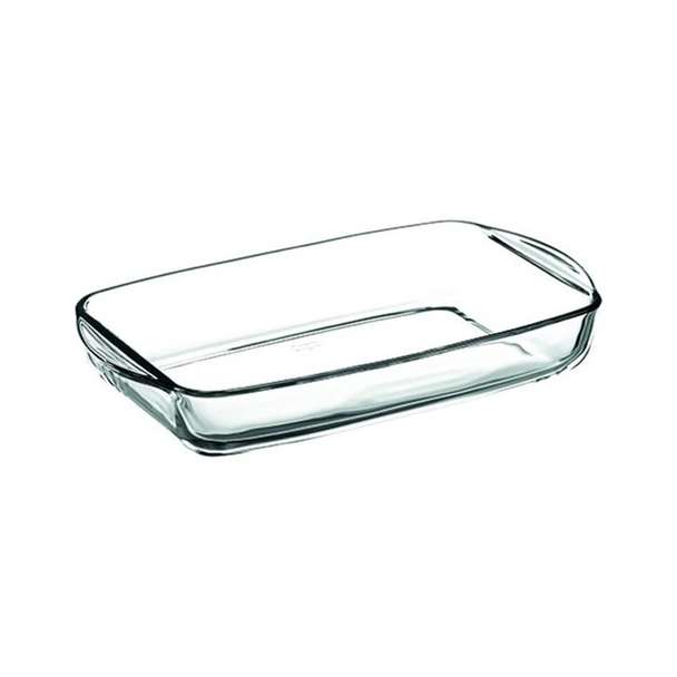 Правоъгълна йенска тава от серията Borcam на PASABAHCE с вместимост 2 л, подходяща за здравословно приготвяне на вкусни ястия от месо, зеленчуци и тесто.
