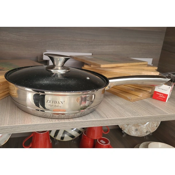 Дълбок тиган с капак на марката ZEIDAN в сребрист цвят, изработен от екологично чиста неръждаема стомана, устойчива на надраскване и корозия.