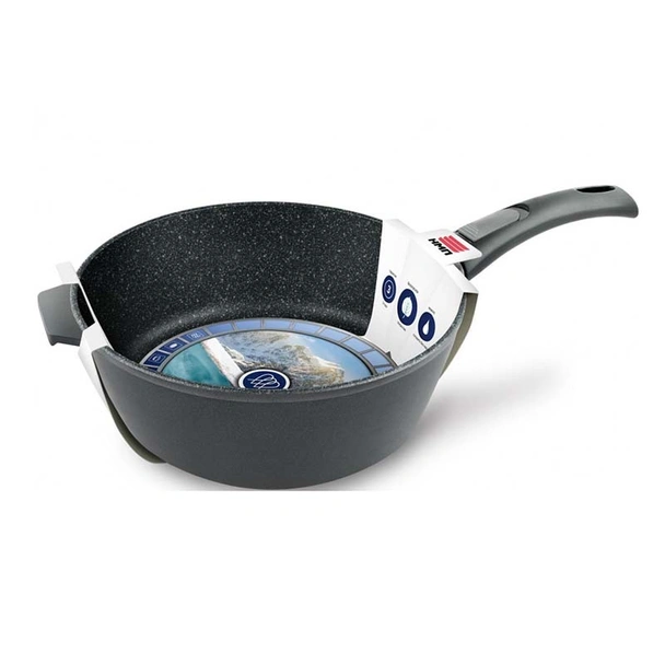Индукционен тиган от серията Алтай природни материали на руската марка НЕВА МЕТАЛЛ ПОСУДА, изработен от лят алуминий в черен цвят.