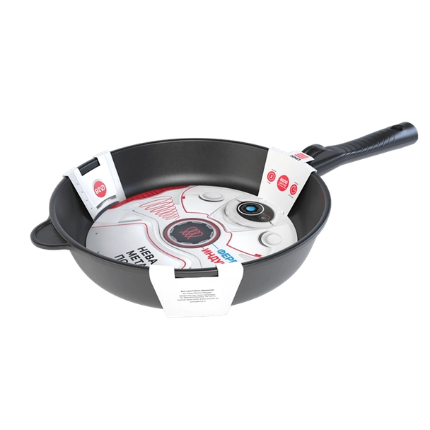 Тиган от серията Ferra Induction на руската марка НЕВА МЕТАЛЛ ПОСУДА с подвижна дръжка, изработен от лят алуминий и с незалепващо керамично покритие.