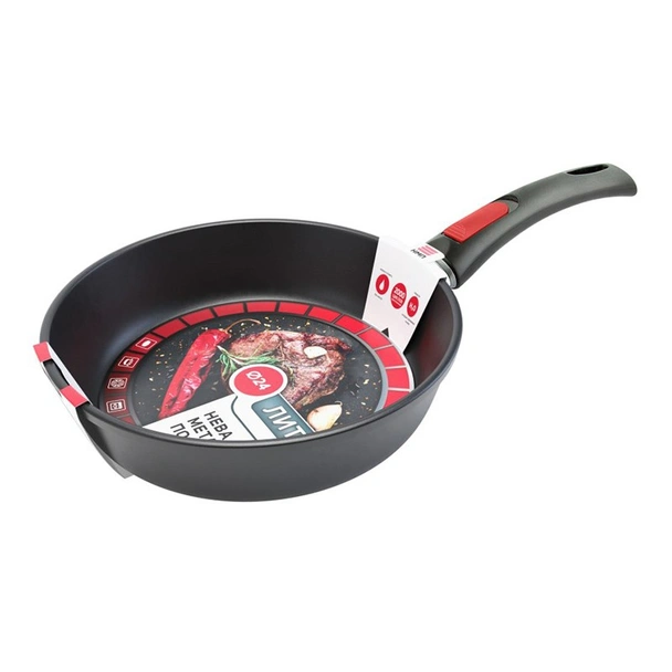 Традиционен тиган от колекцията Cast Series на руската марка НЕВА МЕТАЛЛ ПОСУДА с подвижна дръжка, изработен от лят алуминий и с незалепващо покритие на водно-силиконова основа.