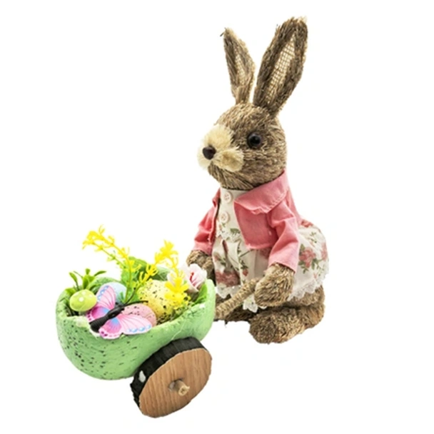 Тази стилна великденска украса може да бъде използвана като централен елемент в пролетна декорация или като допълващ акцент към други празнични елементи. Великденски декоративен заек с количка е отличен избор за декориране на хол, кухня, трапезария или детска стая.