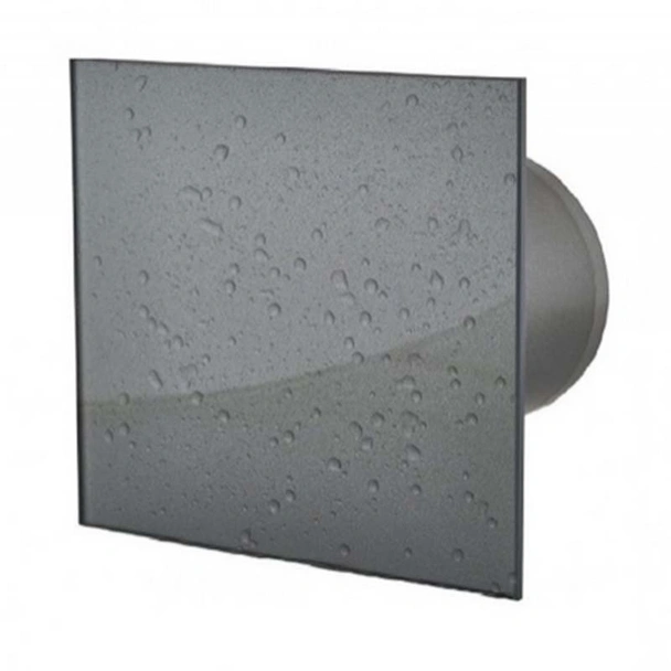 Дизайнерски вентилатор със стъклен прав челен панел, цвят инокс на капки.