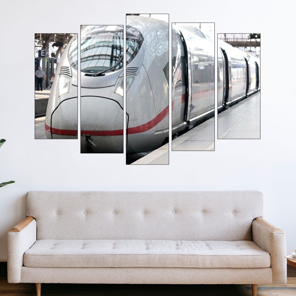 Декорация за стена (картина, пано) с мотив "Влак стрела в Кьолн - картина пано за стена". Изработена от олекотено PVC с дебелина 5 мм или канава от 100% памук, опъната върху дървена подрамка с дебелина 5 см. Изображението се печата с висококачествен UV печат, което е гаранция за запазване на цветовете с години!