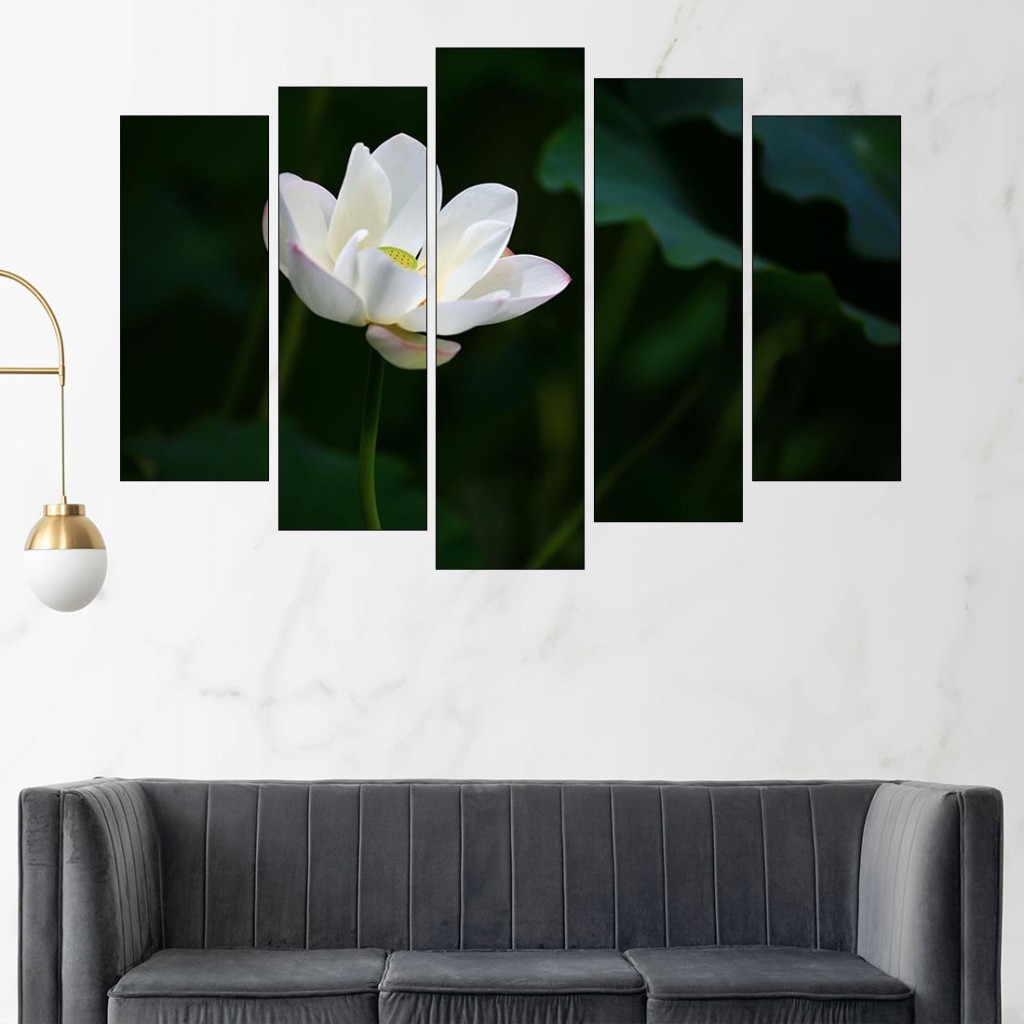 Декорация за стена (картина, пано) с мотив "Цъфнал бял лотос - картина пано за стена". Изработена от олекотено PVC с дебелина 5 мм или канава от 100% памук, опъната върху дървена подрамка с дебелина 5 см. Изображението се печата с висококачествен UV печат, което е гаранция за запазване на цветовете с години!