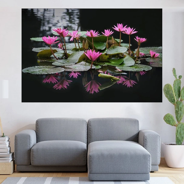 Декорация за стена (картина, пано) с мотив "Цъфнали розови лотоси - картина пано за стена". Изработена от олекотено PVC с дебелина 5 мм или канава от 100% памук, опъната върху дървена подрамка с дебелина 5 см. Изображението се печата с висококачествен UV печат, което е гаранция за запазване на цветовете с години!