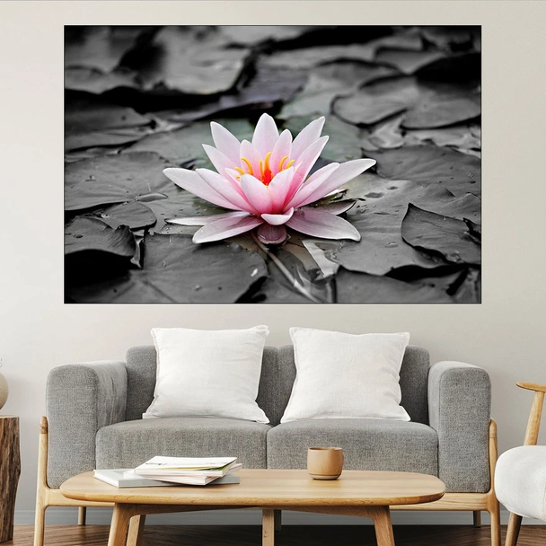 Декорация за стена (картина, пано) с мотив "Розова водна лилия - картина пано за стена". Изработена от олекотено PVC с дебелина 5 мм или канава от 100% памук, опъната върху дървена подрамка с дебелина 5 см. Изображението се печата с висококачествен UV печат, което е гаранция за запазване на цветовете с години!