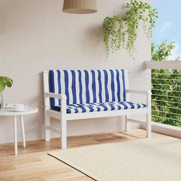 Възглавници за външни пейки 2 бр синьо-бели 120x50x7 см плат - VL361690 от DS HOME са перфектният избор за всеки, който желае да внесе естетика и несравнима мекота в своето външно или вътрешно пространство. Съчетавайки класическия синьо-бял раиран десен с високотехнологични материали, тези аксесоари превръщат всяка стандартна пейка в уютна зона за релакс. С дължина от 120 см, те са идеално пригодени за двуместни градински мебели, добавяйки им премиум излъчване и ергономичност.