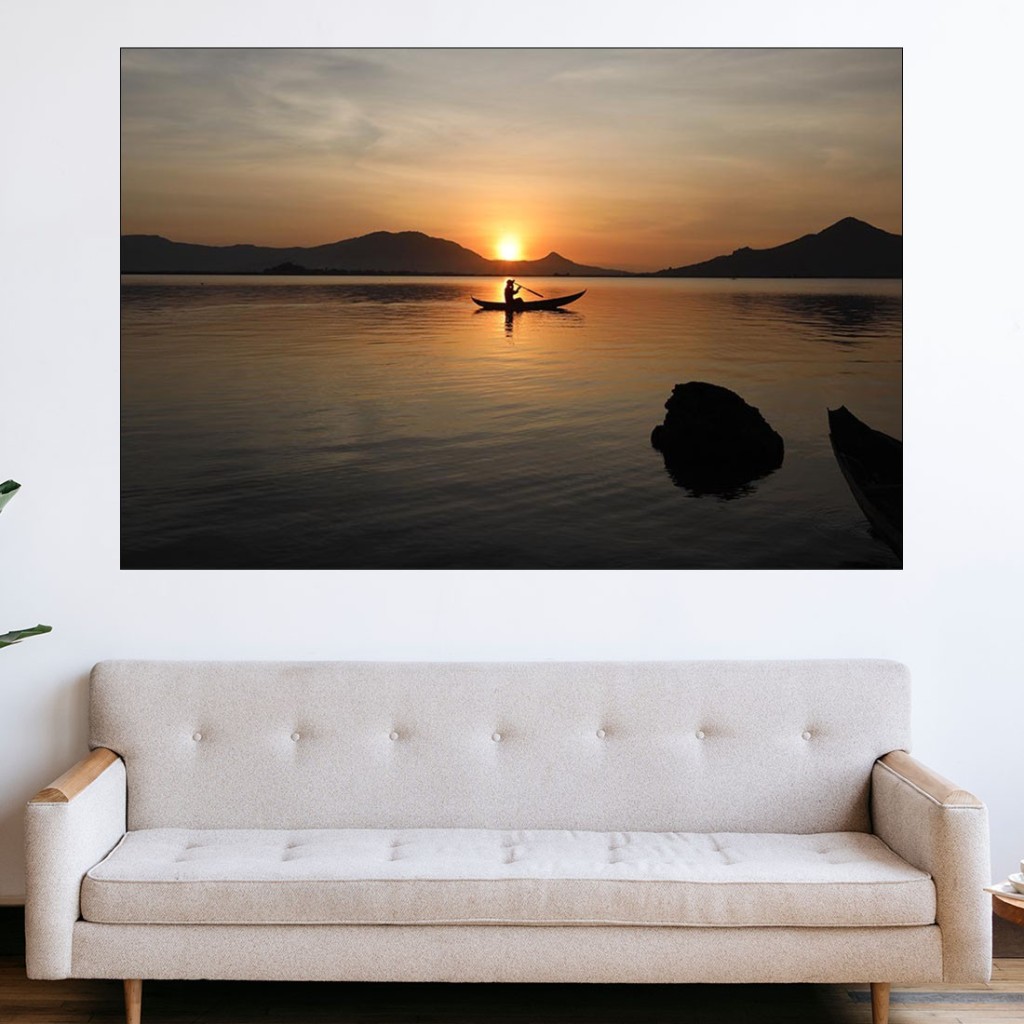 Декорация за стена (картина, пано) с мотив "Рибар с лодка по залез 2 - картина пано за стена". Изработена от олекотено PVC с дебелина 5 мм или канава от 100% памук, опъната върху дървена подрамка с дебелина 5 см. Изображението се печата с висококачествен UV печат, което е гаранция за запазване на цветовете с години!