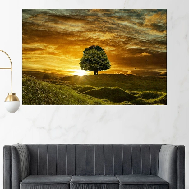 Декорация за стена (картина, пано) с мотив "Залез и самотно дърво - картина пано за стена". Изработена от олекотено PVC с дебелина 5 мм или канава от 100% памук, опъната върху дървена подрамка с дебелина 5 см. Изображението се печата с висококачествен UV печат, което е гаранция за запазване на цветовете с години!