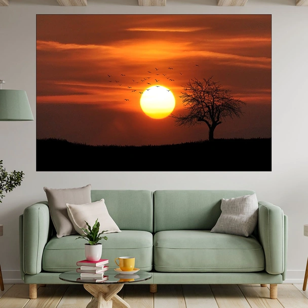 Залез над самотно дърво и птици - картина пано за стена