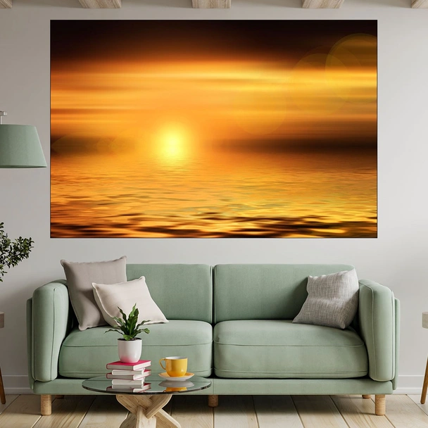 Декорация за стена (картина, пано) с мотив "Залез над спокойни води - картина пано за стена". Изработена от олекотено PVC с дебелина 5 мм или канава от 100% памук, опъната върху дървена подрамка с дебелина 5 см. Изображението се печата с висококачествен UV печат, което е гаранция за запазване на цветовете с години!