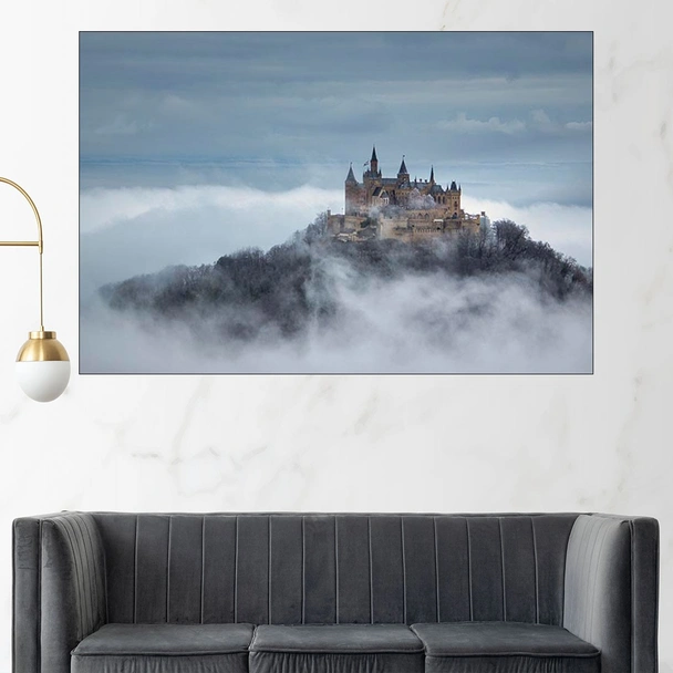Декорация за стена (картина, пано) с мотив "Замък на върха на хълма - картина пано за стена". Изработена от олекотено PVC с дебелина 5 мм или канава от 100% памук, опъната върху дървена подрамка с дебелина 5 см. Изображението се печата с висококачествен UV печат, което е гаранция за запазване на цветовете с години!